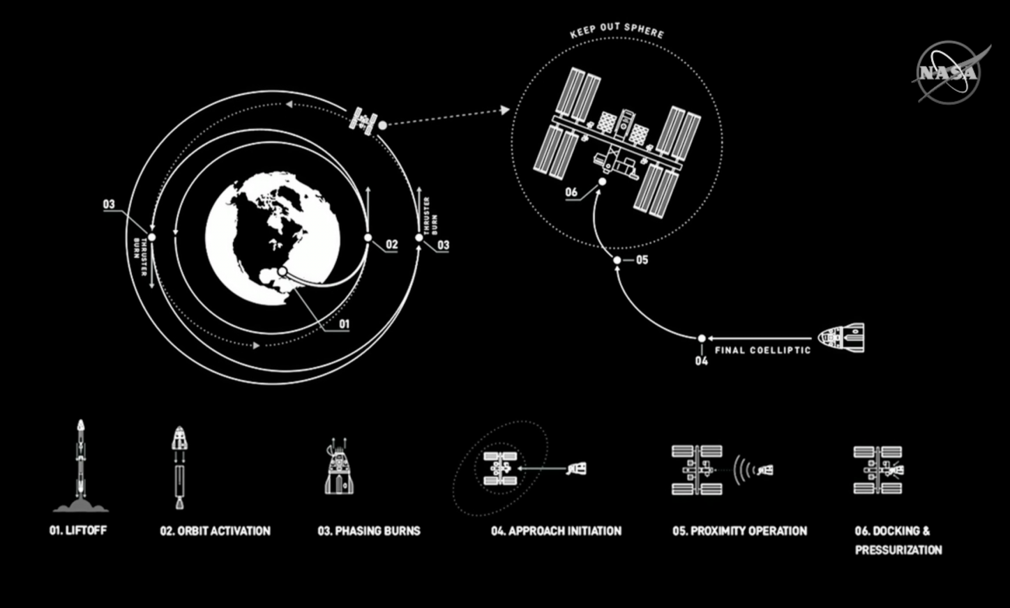 1. การยกตัว (Liftoff) เป็นช่วงที่ส่วนแรก (First Stage) ของจรวดนำส่งฟอนคอน-9 (Falcon-9) จุดระเบิด เพื่อนำอวกาศยานสู่วงโคจร จากนั้นส่วนแรก (First Stage) จะแยกตัวออกมา ทำให้ส่วนที่สอง (Second Stage) จุดระเบิดเร่งความเร็วอวกาศยานจนถึงความเร็ว Orbital Velocity ซึ่งทำให้อวกาศยานครูดรากอน (Crew Dragon) โคจรรอบโลก ส่วนแรกของฟอลคอน-9 จะตกสู่พื้นและสามารถนำกลับมาใช้ใหม่ได้